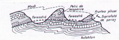 ferestrele tectonice - deschideri cu contur inchis facute de eroziune in corpul panzei, prin care apare la zi autohtonul.