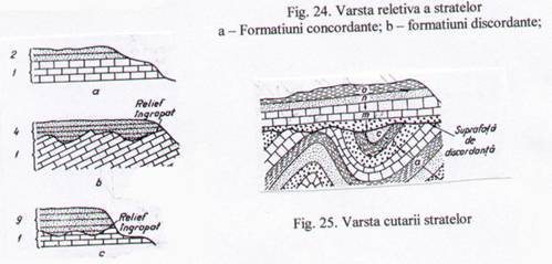 Cand insa formatiunea superioara face un unghi fata de cea inferioara, atunci acestea sunt in raporturi discordante (fig.24 b). Intre doua formatiuni dicordante se constata intotdeuna lipsa unuia sau mai multor termeni stratigrafici, ceea ce presupune existenta unei lacune stratigrafice. Ea se datoreste unei exondari cauzata fie de cutarea stratelor, fie de miscari epirogenice pozitive, timp in care depozitele geologice sunt supuse actiunii eroziunii, dupa care, in urma unei trasgresiuni, suprafata de eroziune este acoperita de depozite mai noi. O lacuna stratigrafica poate fi intalnita si intr-o succesiune stratigrafica necutata, iar suprafata dupa care se face contactul dintre cele doua formatiuni se numeste relief inecat sau ingropat (fig.24 c).