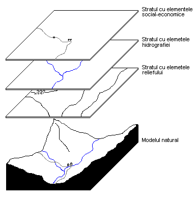 O harta digitala se descompune in mai multe straturi de informatie si invers, mai multe straturi pot forma o harta. Aceasta idee sta la baza organizarii Bazei de Date Spatiala (BDS). Este cel mai eficient mod de stocare hatilor. Straturile pot fi combinate astfel incat sa genereze harti care nu exista in forma traditionala. Cand se creeaza un strat trebuie sa se stie ca acesta este utilizat in intregime, adica entitatile geografice nu pot fi separate. Cu alte cuvinte, daca avem un strat care contine raurile cu limitele bazinelor hidrografice, la o apelare a hartii ambele entitati vor fi afisate chiar daca avem nevoie doar de una din ele. De aceea este bine ca aceste doua tipuri de entitati geografice sa fie stocate pe straturi diferite in cazul in care apar situatii cand ele se vor prelucra separat. De fapt, produsele soft au posibilitatea de a indeparta anumite portiuni din harta sau sa creeze doua straturi mai simple din unul mai incarcat, insa aceasta opertiune poate complica lucrurile in mod inutil. In consecinta, pentru majoritatea prelucrarilor se prefera o structura simpla a unui strat si sa avem mai multe straturi.