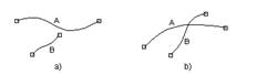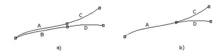 O ultima situatie pe care o amintim este cea infatisata in figura 7a. Se observa o apropiere exagerata a arcelor A si B. Aceasta poate sa apara dintr-o gresala de digitizare sau nu. Pentru a elimina o situatie in care un arc este, practic, dublat s-a introdus un nou concept numit Fuzzy Tolerance, care reprezinta distanta minima ce separa doua arce. Daca distanta dintre arce este mai mica decat cea precizata in Fuzzy Tolerance, arcele A si B se vor contopi si vom avea situatia din figura 7b. In caz contrar, va ramane configuratia din figura 7a.