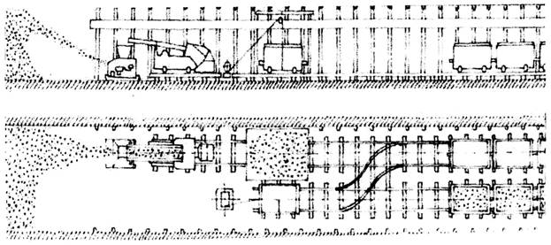 Umplerea lucrarilor orizontale cu rambleu uscat se poate face si cu masina de incarcat, care imprastie sterilul descarcat din vagonete (fig.4) sau cu transportoare cu raclete, ultimul din flux, cel dinspre front, fiind de tip calaret si mobil.