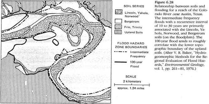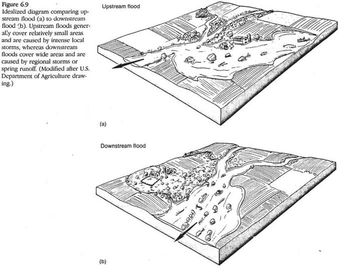 Exista doua tipuri de inundatii: inundatii localizate in cursul superior al raurilor, produse de ploi puternice, dar scurte, pe suprafete mici, si inundatii localizate in cursul inferior al raurilor, generate de furtuni durabile, pe suprafete mari ce provoaca saturarea solului, asocierea unor volume excedente de apa de la multi afluenti si, in final, un proces extensiv atribuit raului principal (fig. 6.9).
