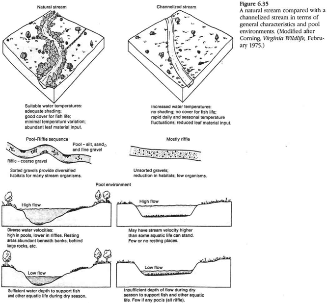 Canalizarea (fig. 6.35) este demeandrizarea, adancirea, largirea, curatirea sau alinierea unor ape curgatoare preexistente. Se considera ca obiectivul principal al canalizarii ar fi controlul inundatiilor si imbunatatirea drenajului. Chiar daca apar si situatii de degradare a mediului prin canalizare, totusi aceasta actiune, in general, trebuie incurajata. Cu precizarea ca, pana la stabilirea unor noi criterii de conceptie, compatibile cu ansamblurile naturale, canalizarea trebuie privita ca o solutie valabila de la caz la caz.