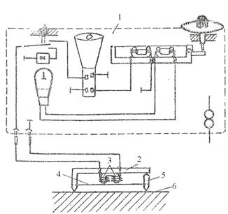 1 - aparat de receptie; 2 - aparat de tensiune a valorilor masurate; 3 - electromagnet; 4 - coarda de otel; 5 - cutie de masurat; 6 - suprafata obiectului de incercat.
