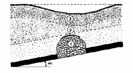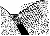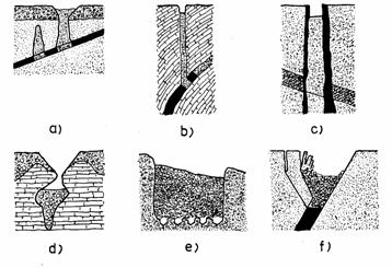 Scufundarile discontinue pot apare si ca rezultat al exploatarii prin surparea rocilor inconjuratoare. In fig.1.e. este ilustrat cazul unei scufundari la scara mare, in urma exploatarii cu surpare in blocuri. De asemenea, in fig.1.f. este prezentata suprafata de scufundare produsa in urma surparii progresive a peretilor de roca din acoperis, in cazul exploatarii prin surparea minereului si a rocilor inconjuratoare.