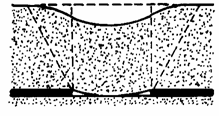 In categoria scufundarilor continue sau scufundarilor propriu-zise se includ acele deformari ale suprafetei care formeaza un profil intins al albiei de scufundare si care se extinde progresiv, odata cu extinderea suprafetei exploatate (fig.2). Deplasarile punctelor suprafetei terenului de la zi, in comparatie cu dimensiunile ariei de scufundare sau adancimea de exploatare sunt ca ordin de marime, in limitele de elasticitate ale formatiunilor geologice. Acest tip de scufundari este caracteristic stratelor sau filoanelor subtiri, orizontale sau usor inclinate, cantonate in roci slabe sau roci sedimentare plastice. Acestea rezulta in urma exploatarii stratelor de carbune cu fronturi lungi de abataj sau exploatarii altor zacaminte de substante minerale utile, cum sunt cele de sulf sau zacamintele de evaporite, cantonate in depozite sedimentare.