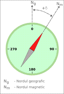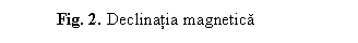 (2) Declinatia magnetica este unghiul masurat intre directia nordului geografic si nordului magnetic. Valoarea declinatiei variaza in spatiu pentru ca polii magnetici si cei geografici nu corespund si pentru ca acest element al campului geomagnetic este influentat si de marile anomalii. Declinatia este considerata pozitiva cand meridianul magnetic este la est de cel geografic (Fig. 2).