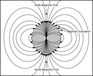 (3) Inclinatia magnetica se exprima prin unghiul masurat in plan vertical intre componenta orizontala si vectorul total al campului geomagnetic (Fig. 3). Altfel spus, inclinatia magnetica ar fi unghiul fata de orizonatala pe care-l face un ac magnetic intr-o pozitie libera. In Romania acesta este de 590 - 600, la ecuator 00 iar la poli 900.
