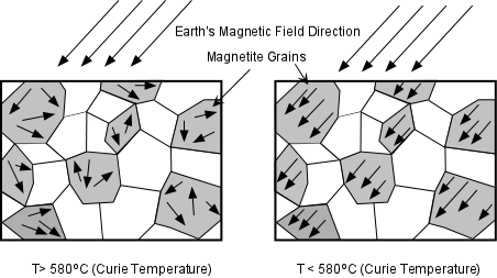 Peste o anumita temperatura numita punctul Curie proprietatile magnetice ale mineralelor dispar. Sub aceasta temperatura, mineralele magnetice pastreaza orientarea directiei campului magnetic din momentul formarii lor (Fig. 4).