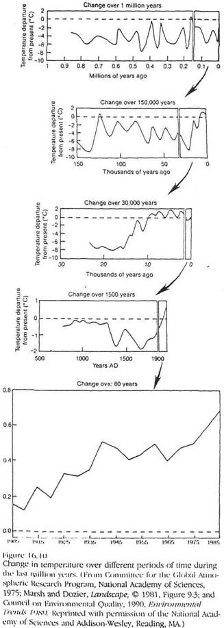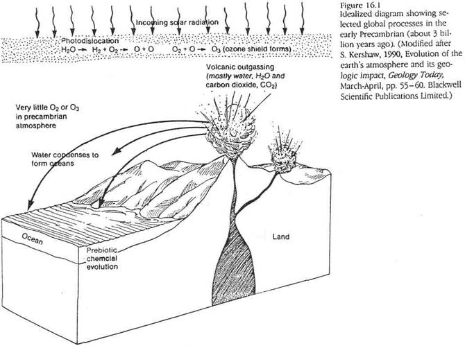 Fig. 16.1 evidentiaza procesele globale din precambrianul timpuriu, deci de acum 3 miliarde ani, cand atmosfera continea putin oxigen. Atmosfera actuala s-a dezvoltat abia dupa 1 miliard de ani, cand s-a raspandit procesul de fotosinteza. Daca ne referim la modificarile in sistemul global, avem in vedere acele schimbari ce afecteaza populatia astazi; ele se raporteaza la variatii de ordinul 1, care dureaza intre 10 -100 de ani (dar mai exista variatii de ordinul 2, raportate la timpul istoric, de mii de ani, de ordinul 3, de zeci de mii de ani, corelabile cu epocile de glaciatiune si de ordinul 4 sau 5, de milioane de ani).