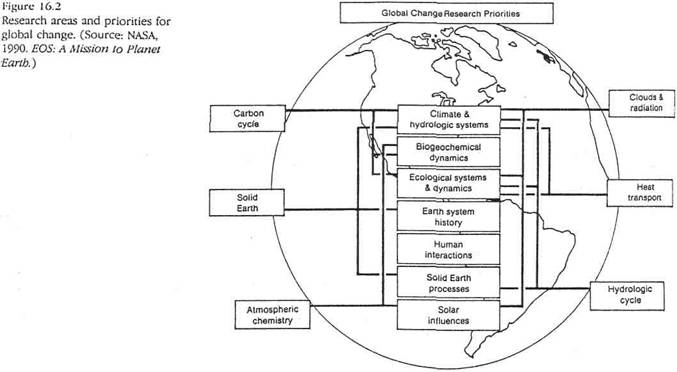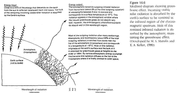Societatea contemporana este ingrijorata in special de modificarile ce afecteaza atmosfera, incluzand: 1) cresterea concentratiei de CO2 asociata tendintei de incalzire a globului; 2) stratul de ozon si discontinuitatile aparute la acest nivel, cu toate implicatiile asupra sanatatii populatiei; 3) cresterea emisiilor de oxizi de sulf si azot, ca precursori ai ploii acide; 4) marirea gradului de poluare a aerului, in special in mediul urban, in acest context fiind necesara o simpla familiarizare cu bugetul energetic al pamantului si radiatia solara, incat sa se asigure o corecta intelegere a proceselor globale si de mediu asociate atmosferei, cum ar fi sus mentionatele efecte de sera sau pierderea ozonului (Fig. 16.5).