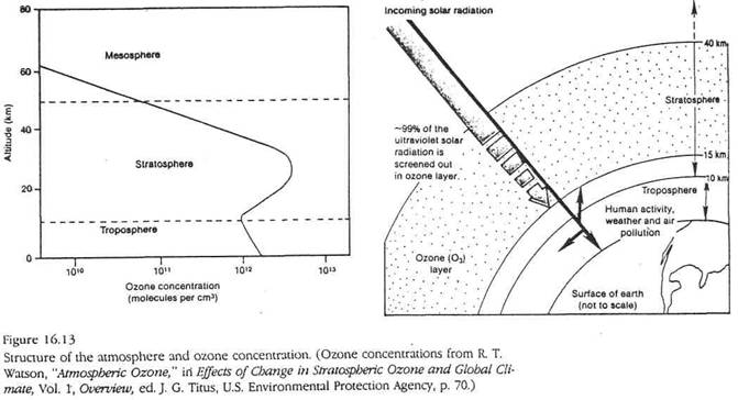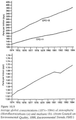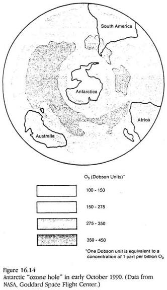 Pierderea de ozon stratosferic permite ca mari cantitati de radiatie sa ajunga pe suprafata pamantului, efectul cel mai frecvent fiind reprezentat de cresterea cazurilor de cancer al pielii si periclitarea vietii marine. Cooperarea internationala in domeniul producerii si propagarii freonului (CFC) a inceput sa-si arate roadele abia la inceputul mileniului 3, deoarece freonul este foarte stabil in mediul limitrof pamantului (Fig. 16.13, 16.14).