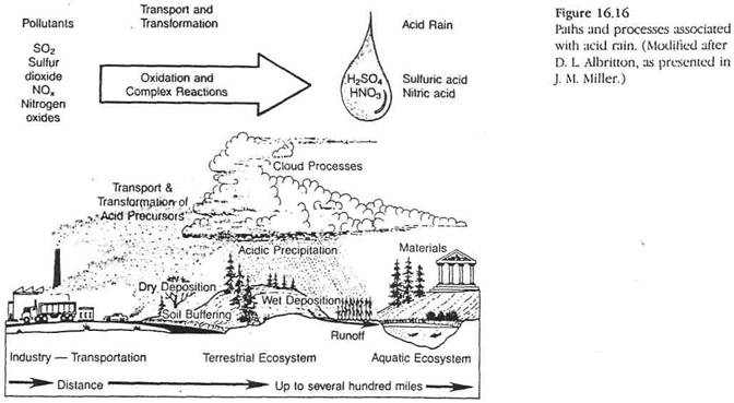 Ploaia acida, care se refera atat la depuneri umede, cat si uscate, acide, se manifesta ca o serioasa problema de mediu in numeroase parti ale lumii. Emanatiile oxizilor de sulf si azot in atmosfera sufera modificari chimice ajungandu-se la acid azotic si acid sulfuric, cu efectele nefaste specifice, respectiv distrugerea ecosistemelor din lacuri, degradarea constructiilor si monumentelor, afectarea ecosistemelor silvice (Fig. 16.16, 16.17).