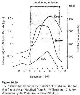 Doua tipuri majore de smog sunt recunoscute in atmosfera urbana, smogul fotochimic si cel sulfuros. Fiecare tip se manifesta creand probleme particulare de mediu in functie de pozitia geografica, anotimp si conditiile urbane locale (Fig. 16.20).
