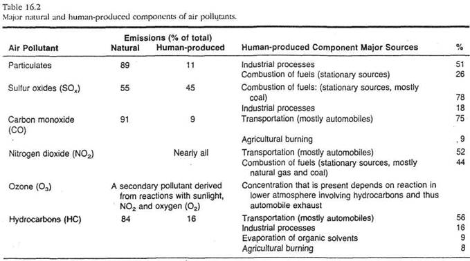 Anumite modificari globale, cum ar fi efectul de sera si perforarea stratului de ozon, se pot conjuga. De ex. CFC, eliberat in partea superioara a atmosferei, difuzeaza in stratosfera, unde clorul este eliberat prin fotodisociere si distruge stratul de ozon. Circa 259-350 milioane tone de poluanti primari sunt deversati anual in atmosfera de deasupra Statelor Unite in urma unor procese datorate activitatii umane. Daca consideram volumul urias al atmosferei, aceasta cantitate este modesta. Daca acest material ar fi distribuit uniform nu ar reprezenta nici o problema de mediu. Din pacate, poluarea se concentreaza deasupra centrelor urbane sau in zone unde aerul natural stagneaza. Tipurile de surse de poluare sunt stationare (punctuale, de ex. cosurile unei uzine, sau multiple, de ex. un complex industrial pe o suprafata mai mare), fugitive (surse poluante in aer liber expuse la vant, care transporta praf, de ex. drumuri neasfaltate, cariere, depozite la sol, constructii demolate), mobile (poluare de la avioane, mijloace auto etc.) (Tabel 16.2).