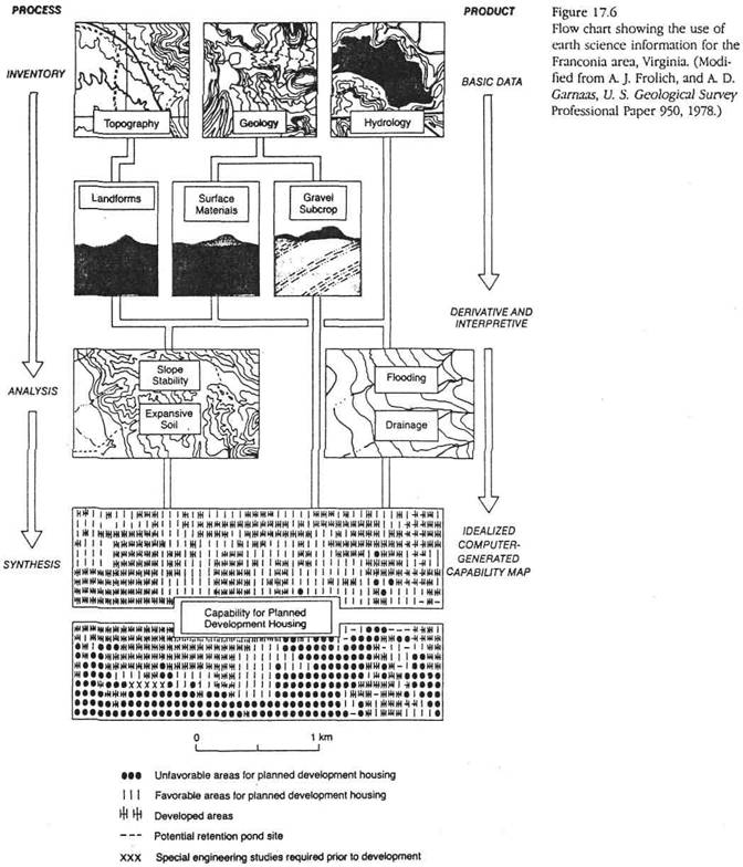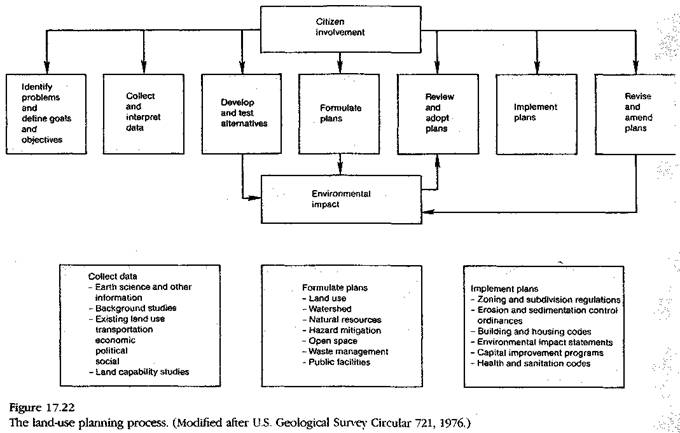 Planificarea si buna gospodarire a teritoriului constituie un element de baza al problematicii de protectia mediului. Criteriul fundamental al unei activitati eficiente in acest sens, vazut din perspectiva specialistului in stiintele pamantului consta dintr-o riguroasa planificare a masurilor de evitare a riscurilor naturale, de conservare a resurselor naturale si, in general, de protejare a mediului. Metodologia in domeniu include mai multe etape: identificarea elementelor / obiectivelor ce trebuie luate in consideratie, colectarea si analizarea datelor, dezvoltarea solutiilor alternative, formularea planurilor de folosire a terenului, revederea si adaptarea planurilor, implementarea planurilor, procedee de revedere si amendare a planurilor (Fig. 17.22).