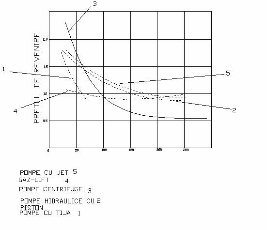 In figura (3.12) se observa ca investitia, in general, scade odata cu marirea productiei zilnice, cel mai economic procedeu la debite mici, din acest punct de vedere fiind pompajul cu jet