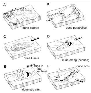O alta varietate de dune sunt in relatie cu vegetatia, barierele topografice sau localizarea surselor de nisip. Varietati de asemenea dune sunt prezentate in fig. 7. In acumularile de nisip care au fost stabilizate de vegetatie, o serie de perturbari care indeparteaza vegetatia duc la formarea unor microdepresiuni de tip cratere (blowout). Acestea au forma circulara sau eliptica, de obicei de numai cativa metri si s-au format prin deflatia nisipului (fig. 7 A).