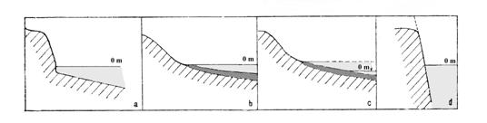 Fig. Tipuri de faleze: (a) functionala; (b) stabilizata; (c) moarta; (d) falsa (tectonica)