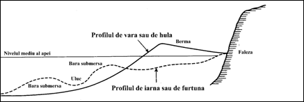 Profilul plajei nu este static, ci sufera anumite schimbari in timp, cele mai semnificative dintre acestea fiind inregistrate pe tarmurile situate la latitudini medii, acolo unde valurile de furtuna au o frecventa mai mare, inregistrandu-se un ciclu anual de eroziune si unul de acumulare. Astfel, in sezonul de vara, datorita predominarii valurilor de hula (swell waves) are loc o faza de constructie a plajei, cu dezvoltarea bermei aproape de nivelul maxim al jetului de resaca. Materialele folosite la constructia bermei provin, in mare parte, din distrugerea barelor submerse. In timpul iernii, pe de o parte, valurile de furtuna reteaza sau distrug complet berma, materialele erodate fiind transportate si depozitate in bare submerse spre larg, de unde vor fi returnate partii inalte a plajei vara viitoare. Din aceasta cauza, adesea se face referire la un profil de vara sau al valurilor de hula (summer sau swell profile), caracterizat prin absenta barelor submerse si prezenta unor berme extinse, si un profil de iarna sau al valurilor de furtuna (winter sau storm profile), la care bermele dispar sau sunt puternic erodate, in schimb aparand o serie de bare submerse (fig. 16.). De aici sa nu se intelega ca profilele de vara sau de iarna apar strict in sezoanele respective.