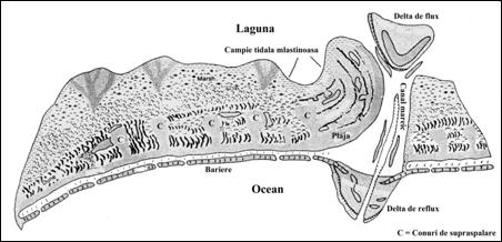 b) Tarmul cu lagune ia nastere prin izolarea partiala sau totala a unor golfuri de catre cordoane litorale, de aceea este asociat adesea cu cel de tip lido sau mexican. In acest fel, fostele golfuri se transforma in lagune, de obicei alungite in lungul tarmului (fig.49), in anumite situatii falezele din spatele lor devenind inactive. Asa s-a intamplat si cu unele dintre golfurile Marii Negre, cel mai concludent caz pentru noi constituindu-l complexul lagunar Razim. Pe glob insa cel mai tipic exemplu de tarm cu lagune este in Golful Mexic, unde alterneaza cu alte categorii (cu limane, cordoane litorale, cu marse etc.).