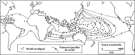 Deoarece dezvoltarea coralilor se face numai in anumite conditii de mediu, distributia recifilor coraligeni este limitata la zona cuprinsa intre cele doua tropice (fig.23.), sau mai precis intre 30 latitudine nordica si 25 latitudine sudica. Conditiile de mediu propice dezvoltarii coralilor trebuie sa fie caracterizate obligatoriu de urmatoarele elemente: o temperatura minima a apei marii in jur de 18 C, cu un optim cuprins intre 25 - 29 C; ape cu o adancime de maxim 60 - 90 m (limita pana la care poate patrunde lumina), cu un maxim al dezvoltarii in jur de 20 - 30 m; o salinitate normala a apei; apa nu trebuie sa contina materiale detritice in suspensie (numarul mic al recifilor din Oceanul Atlantic este explicat prin existenta unor mari cantitati de materiale aduse de marile sisteme fluviale), sa fie bine aerata pentru a permite cresterea lor viguroasa si ca urmare coralii prospera in zonele expuse valurilor ce vin din larg; prezenta unui substrat dur pe care coralii sa se fixeze etc.
