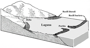 Recifi bariera sunt separati de tarmul propriu-zis printr-o laguna cu latimi variabile, obisnuit intre 2,5 km si 20 km, insa pot sa ajunga pana la 100 km (de exemplu, in cazul Marii Bariere din NE Australiei). Laguna are fundul plat si este putin adanca (20 - 80 m), unele prezentand numeroase constructii coraligene de forma unor coloane, create de coralii adaptati la conditiile oferite de aceste medii adapostite. Reciful poate avea latimi cuprinse intre 5 - 1000 m, in timp ce lungimile pot ajunge la sute de km (de exemplu, Marele Recif din NE Australiei are o lungime de 2 400 km). Uneori in recifii bariera apar deschideri (portite; pass, in engleza) inguste prin care surplusul de apa rezultat din deferlarea valurilor se reintoarce in mare. Adesea portitele apar in fata deltelor ca un rezultat al influentei aluviunilor asupra dezvoltarii coralilor (fig.24.).