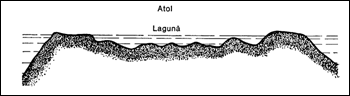Atolii sunt recifi coraligeni de forma aproape circulara, care inchid in interior o laguna (lagoon). In cazul atolilor mari, unele sectoare au fost cladite prin actiunea valurilor si a vantului, formandu-se lanturi de insule scunde, legate prin recifi. O sectiune transversala printr-un atol arata ca laguna este putin adanca, iar pantele exterioare ale acestuia sunt abrupte, coborand adesea pana la sute si chiar mii de metri adancime (fig.25.).