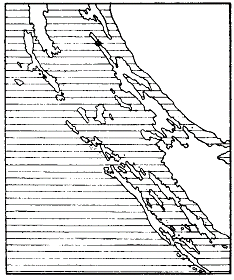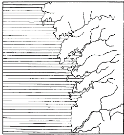 a) Tarmul de tip dalmatic (cunoscute si sub denumirea de tarm cu structura longitudinala sau tarm de tip pacific) se formeaza atunci cand o regiune muntoasa tanara, cu culmi orientate paralel cu tarmul, este supusa unor miscari de subsidenta usoara, sau atunci cand nivelul general al marii creste. Prin submersiune, vaile si depresiunile (corespunzatoare sinclinalelor) se transforma in golfuri inguste si canale, iar culmile (corespunzatoare anticlinalelor) in insule si peninsule inalte, dispuse longitudinal (fig.45.). Acestea sunt caracteristice coastei dalmatice (la Marea Adriatica), extremitatii sudice a statului Chile, vestului Americii de Nord (in dreptul Columbiei Britanice, al Golfului Californiei) si in multe alte sectoare din lungul muntilor Cordilieri si Anzi. Ca subtipuri se pot mentiona tarmul de tip albanez, cu o structura oblica impusa de orientarea culmilor muntoase si cel de tip appalasian cu promontorii in dreptul benzilor de roci rezistente paralele cu litoralul si golfuri la nivelul inflexiunilor axiale dezvoltate pe un substrat mai putin rezistent. Fig. 45. Tarm dalmatic (Posea et al., 1970)