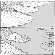 Fig.52. Tarmuri neutre: (A) Tarm deltaic; (B) Tarm cu conuri aluviale; (C) Tarm vulcanic; (D) Tarm coraligen (Strahler, 1973)