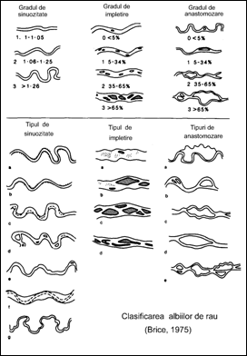 B) Dupa forma in plan, o prima clasificare, cu o foarte larga circulatie este cea propusa de catre Leopold, Wolman, Miller (1964), care au distins trei tipuri principale: albii rectilinii, albii sinuoase si albii impletite. Clasificarile propuse ulterior s-au raportat in principal la trei categorii, continuandu-se identificarea si descrierea de elemente morfogenetice, sedimentologice sau hidraulice care se reflecta intr-un fel sau altul la una din cele trei categorii. Alta clasificare pleaca tot de la configuratia in plan si apartine lui Brice (1975). El distinge albii sinuoase, impletite si anastomozate (fig. 5).