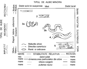 Clasificarea cea mai larg utilizata atat in geomorfologie, cat si in ingineria albiilor a fost propusa de Schumm (1985). Autorul respectiv distinge 5 grupe de rauri care ilustreaza schimbari ce s-ar putea produce in configuratia albiilor daca unul dintre factorii de control (tipul de debit solid, viteza curgerii, puterea raului) ar suferi schimbari (fig. 6). Acestor schimbari le corespund modificari in morfologie, in special in ce priveste raportul adancime/latime, gradientul s.a.