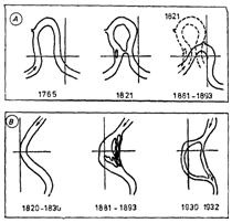 Fig. 8. Tipuri de autocaptare a meandrelor: A, prin strapungere; B, prin repezis (Walters, 1975).