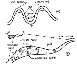 Fig. Planul (A) si sectiunea transversala a structurilor sedimentare a unei renii (B) (Nanson, 1980).