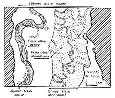 In ce ne priveste, definim drept 'albie majora' zona relativ neteda, adiacenta albiei minore, formata in ultima perioada a timpului geologic (ultimul Glaciar - Holocen) prin dominarea proceselor de acretie verticala si acretie laterala, delimitata de abrupturi marginale (uneori chiar direct de versanti de regula frunti de terasa, ce se dezvolta de o parte si de alta a vaii si care reprezinta 'obstacole' in calea migrarii laterale a raului (fig. 13).