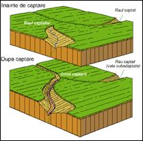 a) Elementele morfologice ale unei captari fluviale sunt: raul captator - raul agresiv care reuseste sa patrunda intr-un bazin vecin si sa-i rapeasca o parte din cursul si din afluentii sai; rau captat - cel detasat de sistemul din care a facut parte si incorporat la bazinul captatorului; raul decapitat - parte dintr-o artera hidrografica (vale), situata in aval de locul captarii, careia i s-a rapit o parte din bazin.