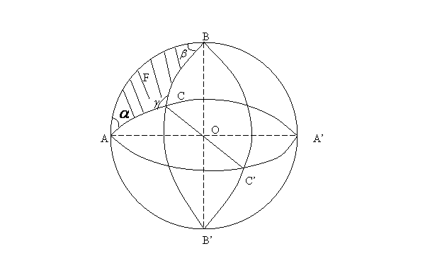 Consideram figura de mai jos in cadrul careia reprezentam pe suprafata sferei medii, triunghiul ABC, ale carui unghiuri au valorile a b g si a carui suprafata o notam cu F.