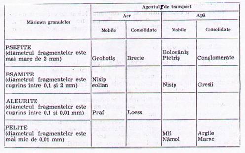 Dupa marimea fragmentelor care le compun, rocile detritice se impart in patru subgrupe : psefite (diametrul fragmentelor este mai mare de 2 mm), psamite (diametrul fragmentelor este cuprins intre 0,1 si 2 mm), aleurite (diametrul fragmentelor este cuprins intre 0,1 si 0,01 mm), pelite (diametrul fragmentelor este mai mic de 0,01 mm), iar dupa cum aceste fragmente sunt libere sau cimentate se pot grupa in doua categorii : mobile-necimentate si consolidate-cimentate.(tab. 1)