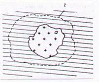 a - corp intruziv ; b - conturul zonei supuse metamorfismului.