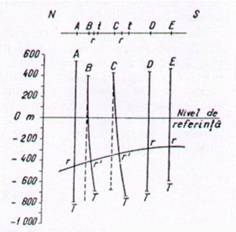 A, B, C, D, E - sonde ; T - talpa sondei ; t - proiectia talpii pe linia de sectiune ; r - pozitia reperului in plan orizontal ; r` - pozitia reperului in plan vertical.