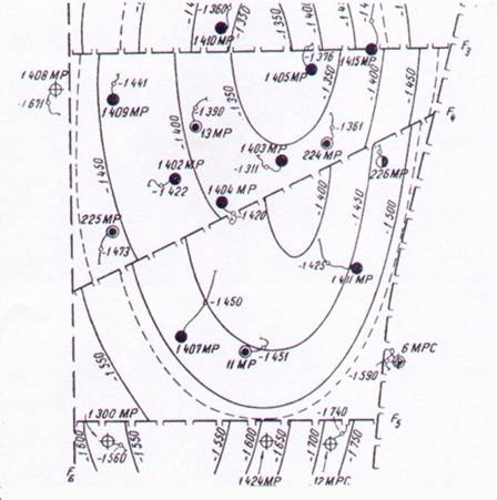 Fig.99. Harta cu izobate, cu sonde deviate la care s-a marcat adancimea reperului pentru care s-au construit izobate.