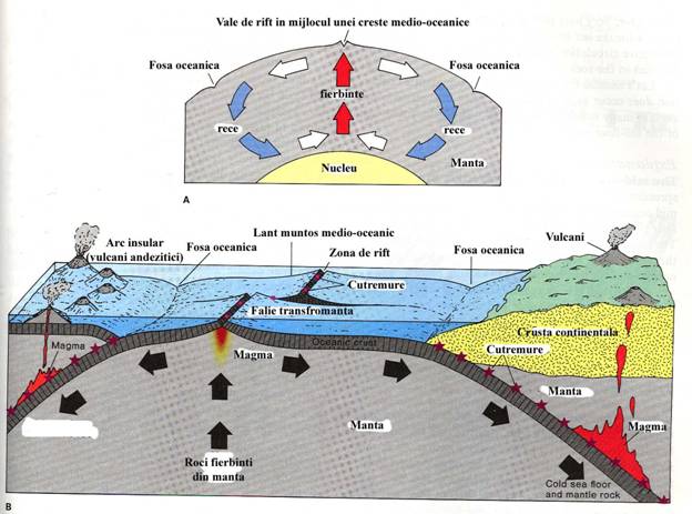 Zonele de rift unde placile se misca divergent, corespund ramurilor ascendente ale curentilor, iar zonele de convergenta, ramurilor descendente. Ramurile descendente ale acelorasi curenti situati sub "planele Benioff" determina afundarea placilor oceanice sub cele continentale si impingerea lor pana in zona "temperaturilor" de topire. In aceste zone se vor forma focare si vetre magmatice, sediul aliniamentelor vulcanice situate pe marginile continentelor (vezi cercul de foc al Pacificului). Aceasta ipoteza da raspuns la numeroase procese geologice si geofizice (inclusiv deriva continentelor).