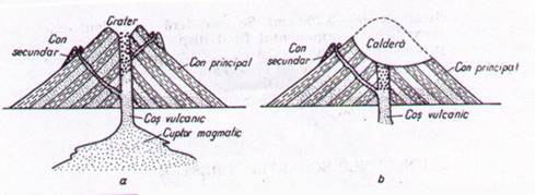 Muntii vulcanici au forme conice terminate cu, crater (fig.6). Prin eroziune, explozii sau prabusire, partea superioara a conului vulcanic poate fi distrusa, iar forma ramasa se numeste caldera (depresiune circulara inconjurata de o margine inalta). Muntii vulcanici pot aparea izolati, ca de exemplu Kenya si Kilimandjaro din Africa, sau de-a lungul unor fracturi majore ale fundamentului cum este cazul lantului vulcanic Oas-Gutai-Tibles-Calimani-Harghita.
