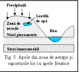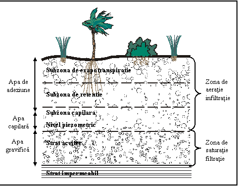 a) Zona de aeratie reprezinta partea situata deasupra nivelului piezometric, cu grosime variabila, in functie de oscilatiile acestuia.Cuprinde trei subzone: