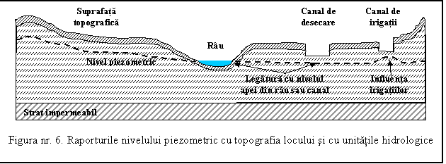In general suprafata piezometrica urmareste, in mare, suprafata topografica, dar mult mai estompat si cu unele accidente suplimentare, in cazul aparitiei punctelor de descarcare (izvoare, in albia unui rau, intr-un canal, intr-o transee, in caz de irigatii etc. (figura nr. 6).