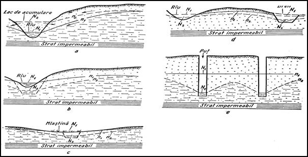 Varietatea mare a situatiilor din teren impune forme diferite ale suprafetelor piezometrice care se grupeaza in trei tipuri: