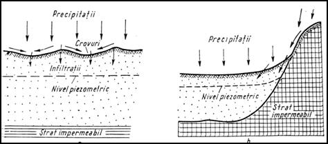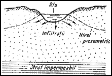 Figura nr. 8. Alimentarea stratelor freatice din retele de suprafata (dupa I. Preda si P. Marosi, 1971)