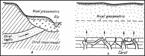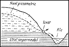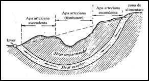 - izvoare arteziene: pe linii de falie, strate monoclinale si sinclinale. Au debit constant;