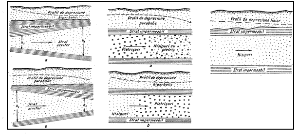 b) Morfologia suprafetelor piezometrice, in cazul lor, este mai greu de urmarit. Dupa forma acestei suprafete stratele acvifere de adancime sunt cilindrice cand curgerea e uniforma si parabolice sau hiperbolice in cazul curgerii neuniforme. (Figura nr. 1)