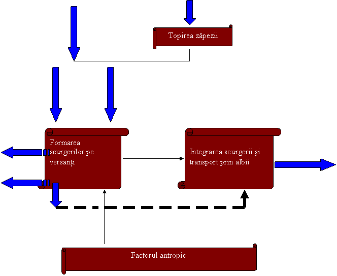 In figura 2.3 se prezinta schema sistemului hidrologic in care sunt cuprinse intrarile, componentele si iesirile din sistem. In figura se utilizeaza urmatoarele notatii: